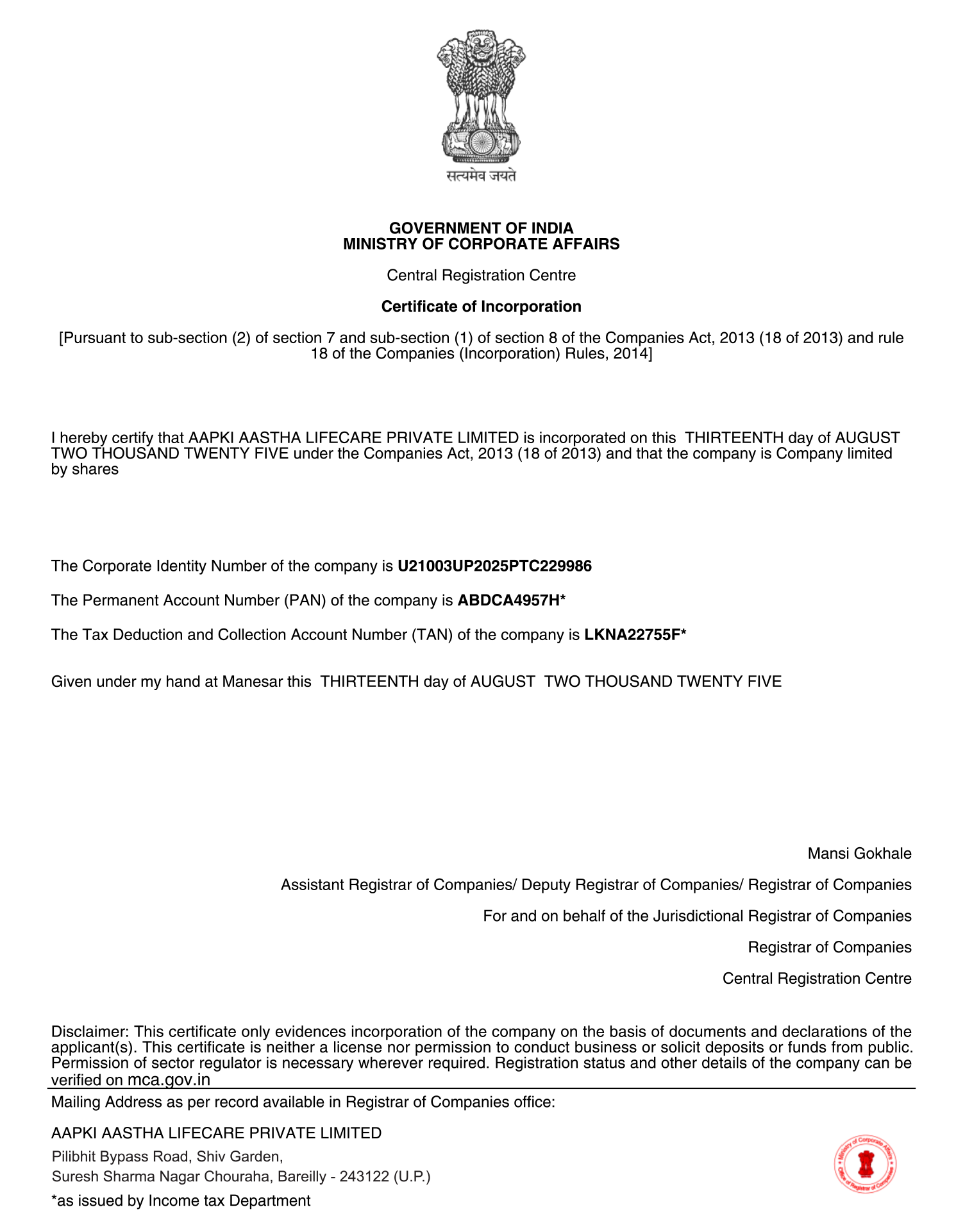 आपकी आस्था लाइफकेयर प्राइवेट लिमिटेड में